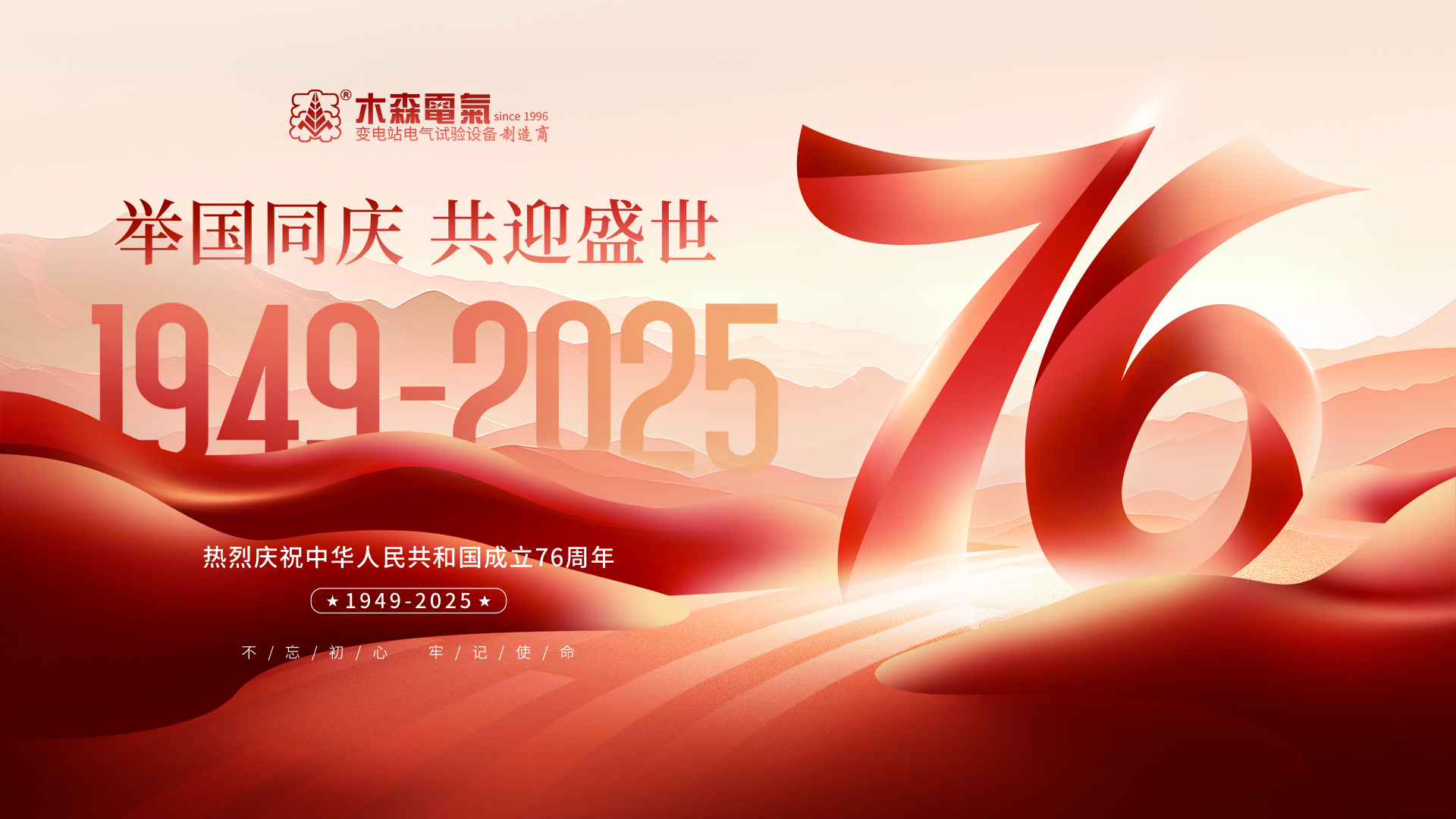 ??七十六載風(fēng)華正茂,九州方圓燈火輝煌。?? 值此中華人民共和國(guó)成立76周年國(guó)慶佳節(jié)來(lái)臨之際,武漢市木森電氣有限公司攜全體員工,向長(zhǎng)期以來(lái)信賴與支持我司發(fā)展的各級(jí)電力單位、行業(yè)伙伴與廣大客戶,致以最崇高的敬意和最誠(chéng)摯的節(jié)日祝福!